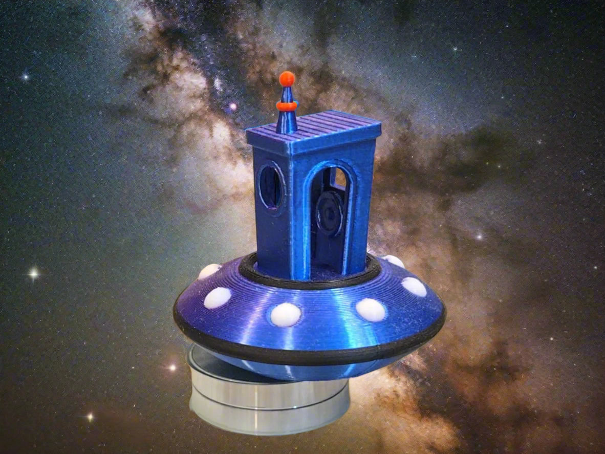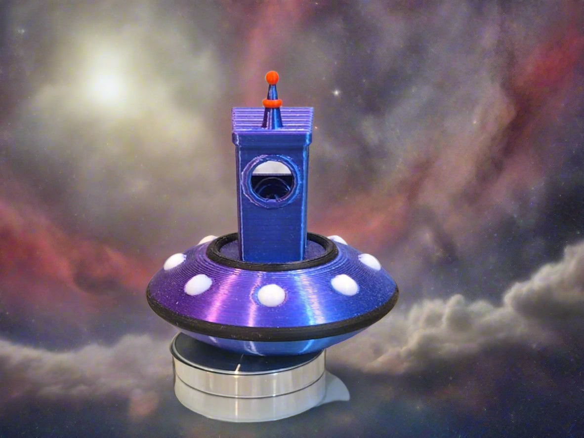 Handcrafted with vibrant, galaxy-inspired colors, this miniature UFO features a whimsical tower design rising from its saucer base. The shimmering purple and blue finish, accented with glowing white “portholes” and a bright antenna topper, makes it a conversation starter wherever it lands.